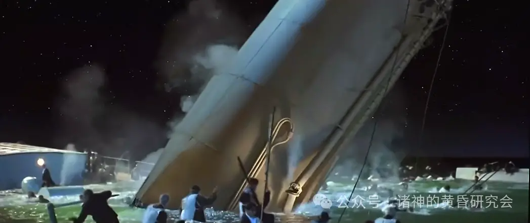 史实:当船在水中倾斜时,生还者作证说,他们全都看到”泰坦尼克”号的船尾升起,据说它与海面已经达到30度至45度的夹角。