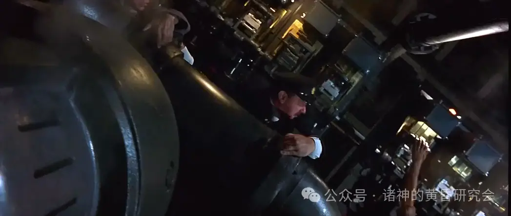 情节:倾斜的机房里,轮机长和工作人员们仍在努力保持发电。