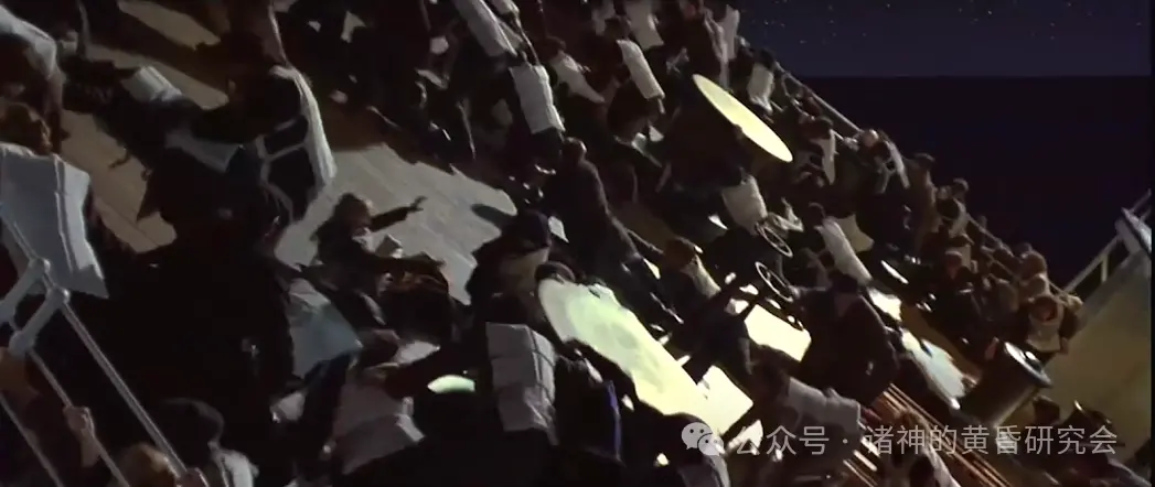 情节:船剧烈倾斜时,许多人往下滑落,摔在远处。