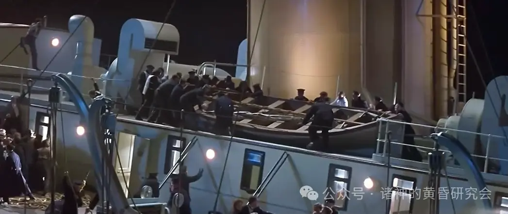 情节:许多男子聚集在烟囱旁的船舱顶部,他们合力尝试将一艘救生艇推下来用。