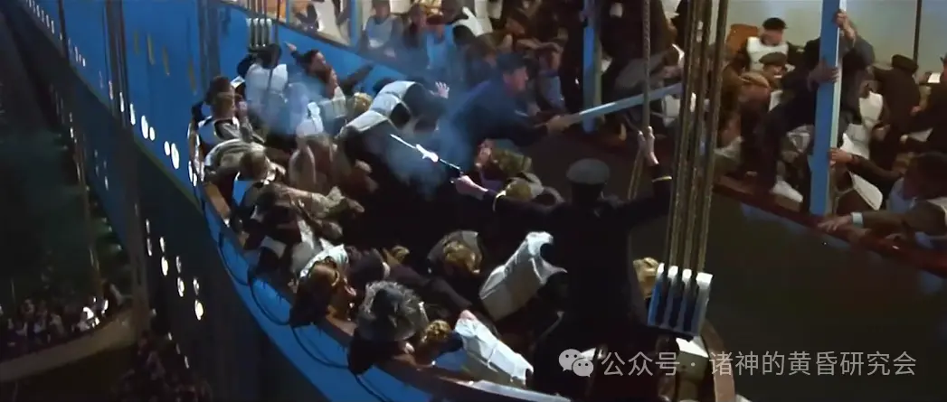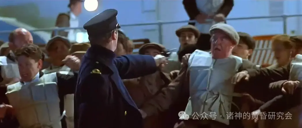 史实:当14号救生艇降下前,一群乘客试图冲上16号救生艇,五副哈罗德·罗威立即用他的左轮手枪对空鸣枪三次,以控制人群、避免造成伤害。
