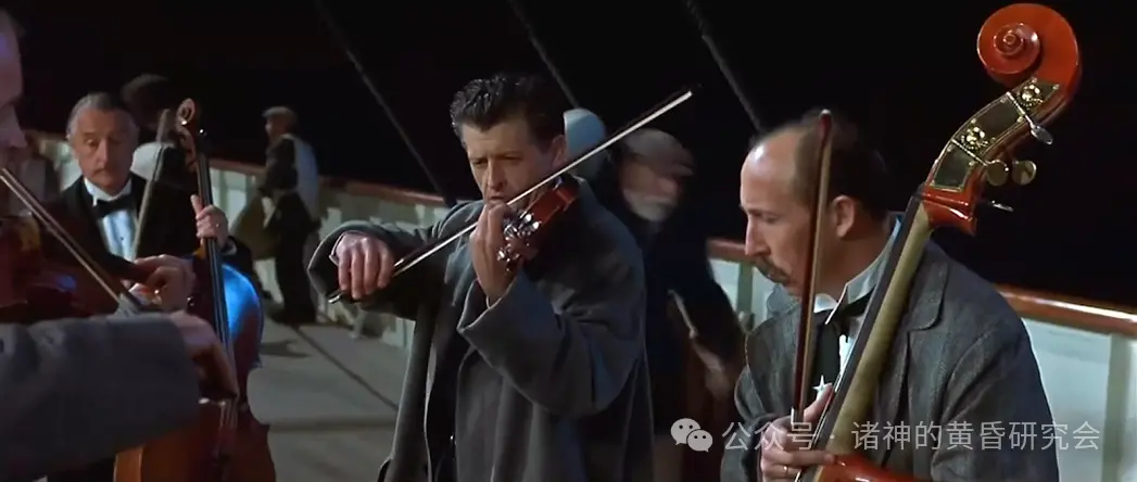 史实:音乐家们原先在室内透过音乐安抚乘客,后来自行移动到小艇甲板上演奏。许多生还者表示,华莱士·赫特利和乐队一直都在演奏,直到最后沉没为止,乐队成员全数罹难。