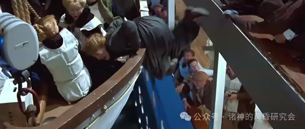 情节:一名女子遭旁人推挤,危险的抓住救生艇边缘,下层甲板走廊上有男子将她安全抱回船上。