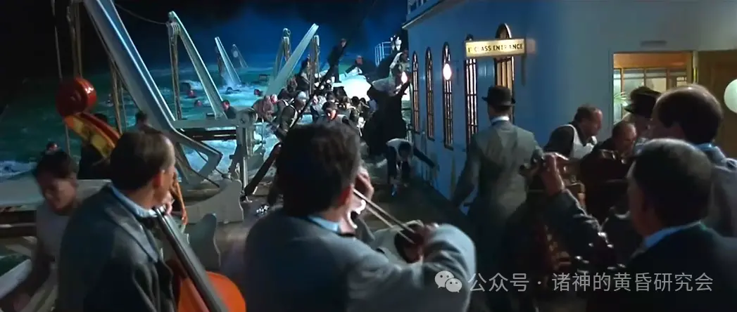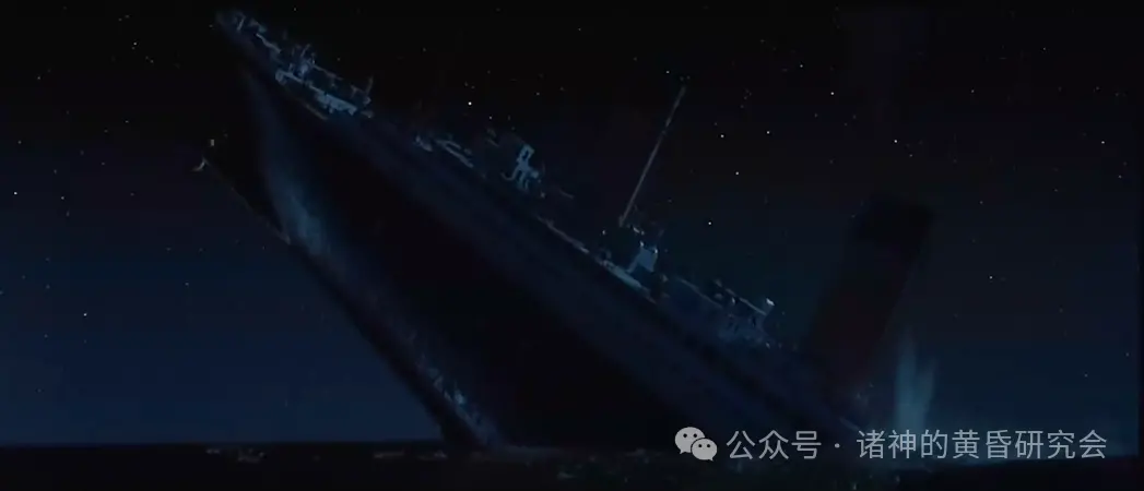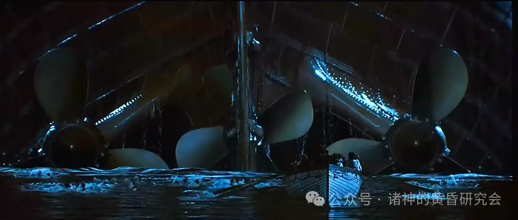 史实:”泰坦尼克”号在最后时刻,船上全部灯光闪烁了一下,然后完全熄灭、陷入黑暗。
