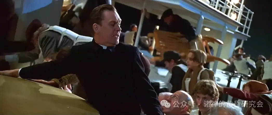 史实:神父托马斯·拜尔斯据说曾两次拒绝登上救生艇。当人群逃往船尾时,他正手持玫瑰念珠、聆听众人忏悔并给予赦免,最后罹难。