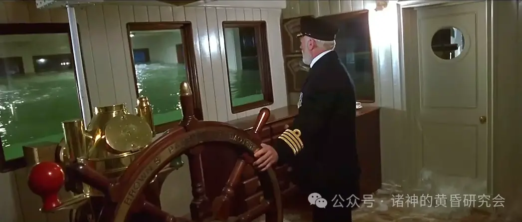 情节:船长爱德华·史密斯神情恍惚,茫然的走进舰桥,把自己关进操舵室,并在那里抓着舵轮任由海水淹死。