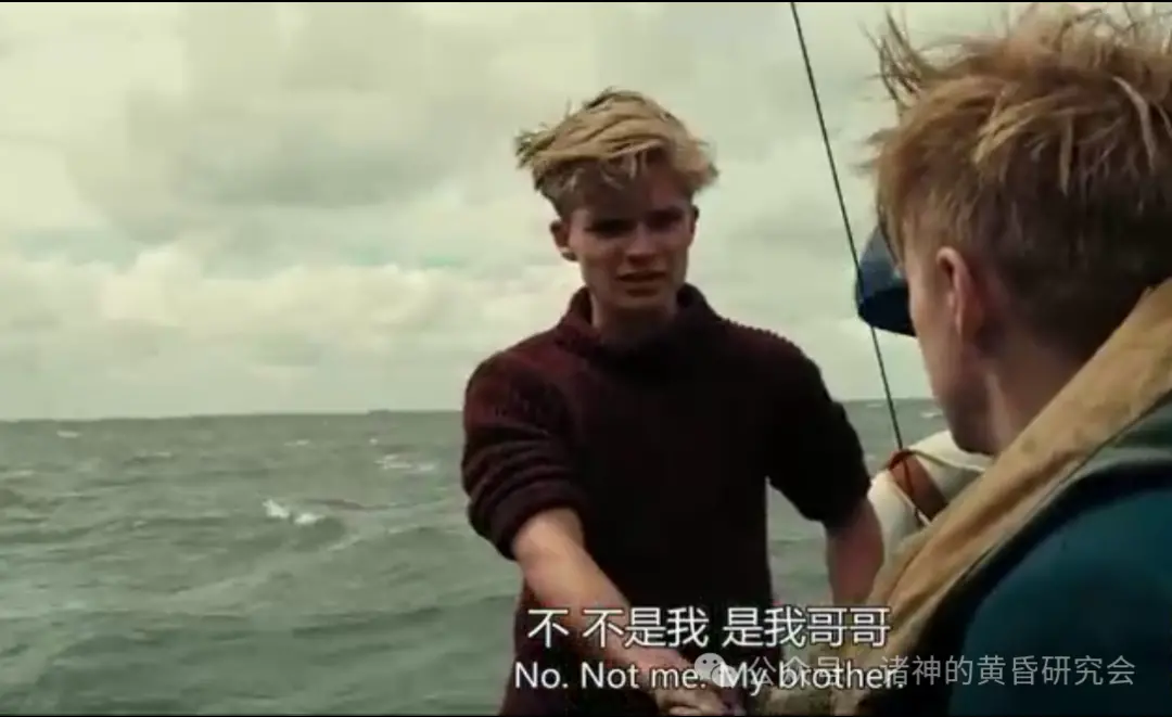 情节:卡尔听到下方吵闹,探头出去查看,海面上两艘救生艇几乎上下撞在一起,有男子持小刀努力割开绳索。