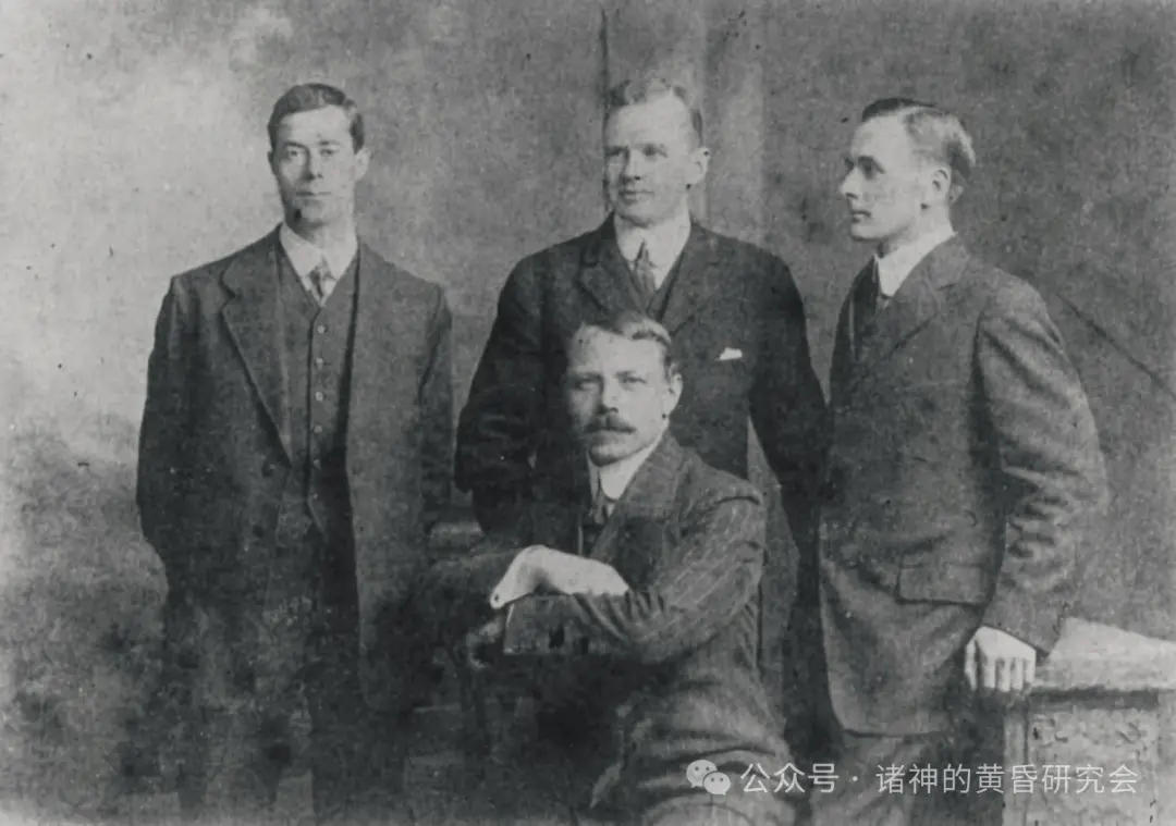 1912 年,泰坦尼克号的四名幸存船员。从左起顺时针方向:五副哈罗德·罗威、二副 莱托勒、四副约瑟夫·博克斯哈尔(Joseph Boxhall);三副赫伯特·皮特曼(就座者)
