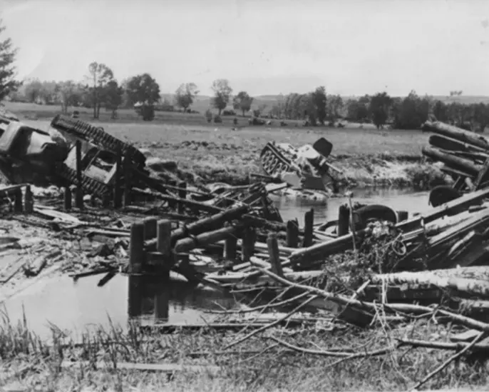 这支苏联红军纵队在横渡第聂伯河支流时遭德国空军空袭。画面中偏右位置可见两辆早期型号的T-34坦克