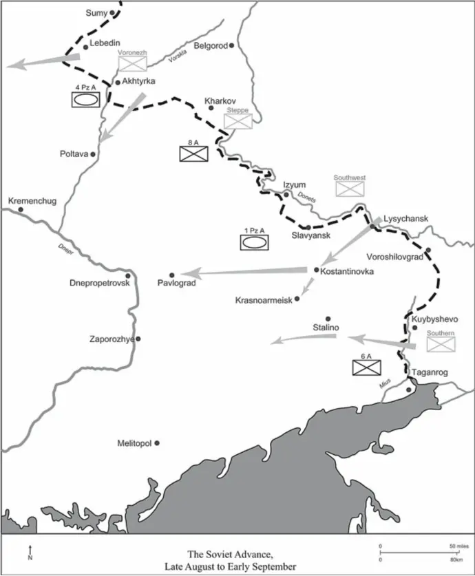 1943年8下旬至9月初,苏联红军对乌兰克战区德军的挺进态势图