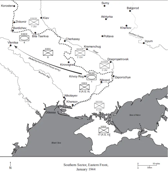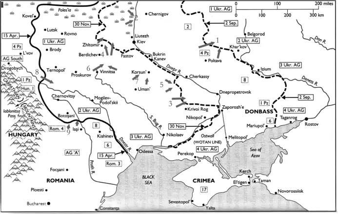 尽管这些计划提供了可能性,但德军的这两次进攻都未能超出计划阶段并付诸于实施。11月3日,由瓦图京将军指挥的苏联乌克兰第1方面军从其基辅北部的桥头堡进行突破,并于11月6日攻占了该市。尽管执行防御的德军第4装甲集团军进行激烈抵抗,但仍逐渐被苏联红军击退。一周之内,苏联红军坦克部队向南推进了40英里,向东推进了90英里,并在此过程中夺取了法斯托夫、科罗斯坚和日托米尔等重要交通中心。苏联最高统帅部利用这一战果,开始向该地区调入另外四个集团军以及大量坦克和机械化军。南方集团军群的整个北翼似乎濒临崩溃,这场灾难将迫使德军放弃沿第聂伯河的防线并向西南撤退。这进而将在东线战场的德军战线中部和南部之间撕开一个巨大的缺口。