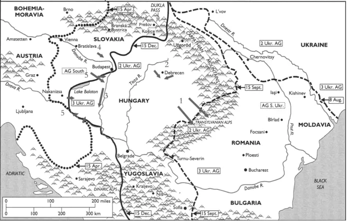 [34]:这些数据未包含近卫坦克第6集团军。另有201,500名苏军及400辆战车配属给北面的乌克兰第二方面军,或驻守布达佩斯以东的预备队——近卫第9集团军。
