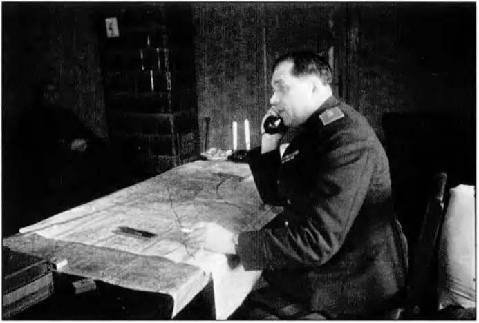 苏联近卫坦克第5集团军司令员瓦西里·季莫费耶维奇·沃利斯基正于办公桌前接听电话