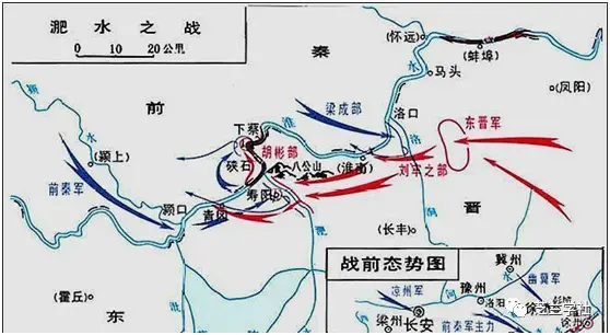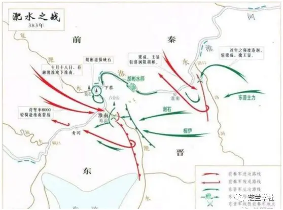 淝水之战可以说是北府兵的高光时刻,其年七月,苻坚大举入侵东晋,计步兵六十余万,骑兵二十七万,由苻融和慕容垂率步骑二十五万为前锋,是年十月占据寿阳。东晋以谢石为征讨都督,以徐、兖二州刺史谢玄为前锋都督,与辅国将军谢琰(yǎn) 、西中郎将桓伊等率众八万迎战;另派龙骧将军胡彬率水军五千增援寿阳。前秦梁成率先遣部队五万屯驻洛涧(今寿县西南),“栅淮以遏东兵”。谢石去洛涧二十五里而军。胡彬得知寿阳已被破,退保浃石。十一月,刘牢之率五千袭取洛涧,歼灭秦军一万五千,杀梁成。晋军乘胜至淝水右岸。谢玄为迅速与秦军决战,遣使苻融要求秦军略向后退,“使晋兵得度,以决胜负”。由项城率轻骑八千赶来寿阳的苻坚与前锋主帅苻融同意秦军后移,企图半渡而击,“以铁骑蹙而杀之”。谁知一退而不可复止,俘将朱序在阵后大呼“秦兵败矣”,秦军顿乱,苻融驰骑掠阵,马倒后被晋兵所杀,苻坚也为流矢击中,秦军全线崩溃,“自相蹈藉投水死者不可胜计,淝水为之不流”。 淝水之战,根本原因是人心背向,但与北府兵英勇作战也是分不开的。东晋用于淝水之战的军队共计八万五千人,其中有胡彬水军、谢琰“台兵”、桓伊西府兵,还有桓温部将檀玄所部,实际参战北府兵只有五万左右(杨德炳《关于北府兵的兵数与兵将来源》