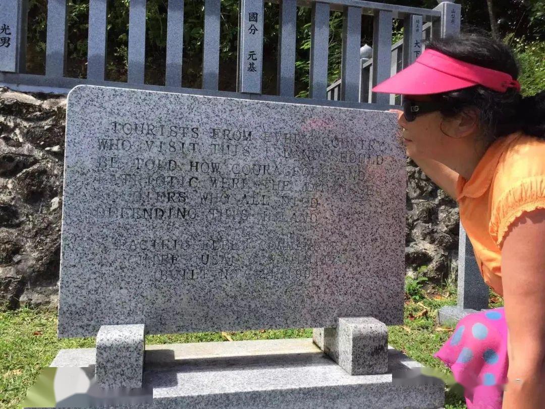 这块毫不引人瞩目的低矮石碑上模模糊糊的英文引起了我的注意(因为日军墓地的石雕皆是满眼帘的日文)。我蹲下身子,睁大眼睛仔细一行行凝视石碑上的斑驳难辨的英文,当我认出了切斯特·威廉·尼米茨(Chester William Nimitz)的石刻签名时立即热血沸腾了,这石头一定记载着非同寻常的历史事件!我一边大声念出, 一边满怀惊愕,掏出苹果手机记载下这些早已被世界遗忘的珍贵文字: