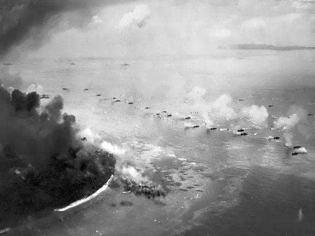日军的火炮也同时对向正在登陆的美军登陆艇开火,因日军火炮点距离海岸线仅仅50米,基本弹无虚发,整个海滩上在短时间内就堆满了美军的尸体和被击毁的登陆艇两栖装甲车,就这样,美军首次登陆的两个陆战营一大半的士兵都断魂在血海包围的小岛,美军指挥部下令撤退,第一次登陆进攻以失败告终。