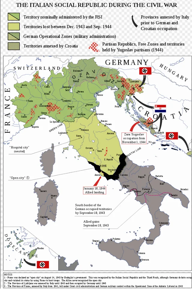 1943年9月8日,意大利正式向盟军投降,纳粹德国的军队迅速南下占领罗马,救出墨索里尼,并建立了意大利社会共和国傀儡政权。