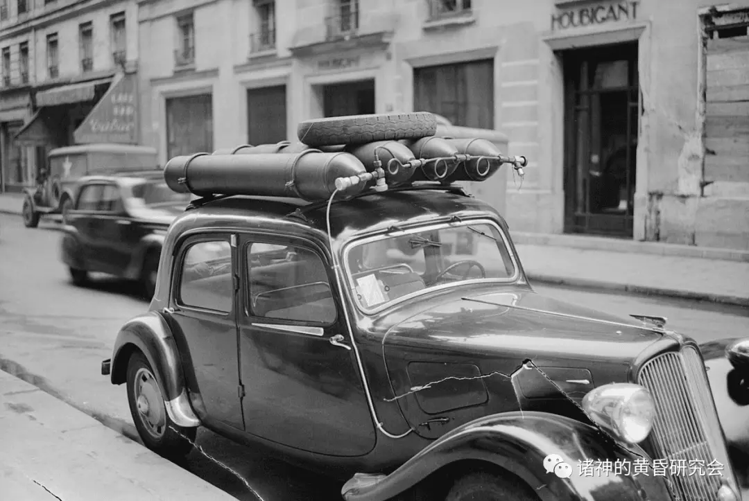 因为缺汽油,马车比较流行,横幅标语:“德国在各方面都取得了胜利”