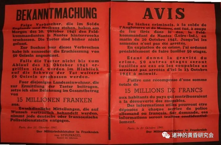 国防军立刻做出反应,在南特枪毙了50个人质,并宣布如果10月23日前暗杀者不自首的情况下,将再次枪毙50人,毫无悬念,24日那50个人被处决,24日在波尔多也枪毙了50个人质。
