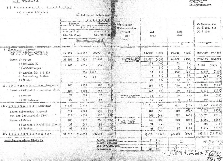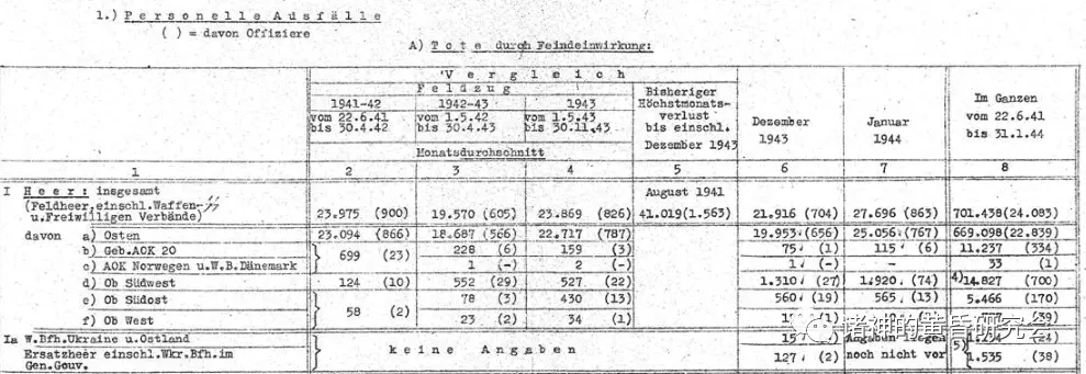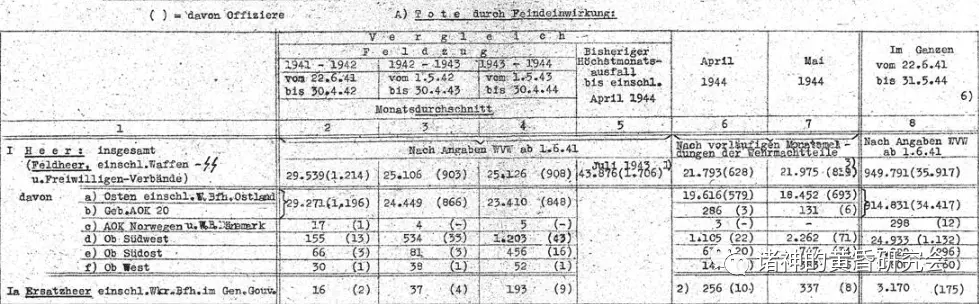 国防军最高统帅部1944年1月31日的统计显示一共有777人战死在西线(下图f行),有意思的是只有1134人战死在乌克兰和波罗的海沿岸国家军事占领区(Wehmacht Befehlshaber in Ukraine und Ostland,见下图倒数第二行)。