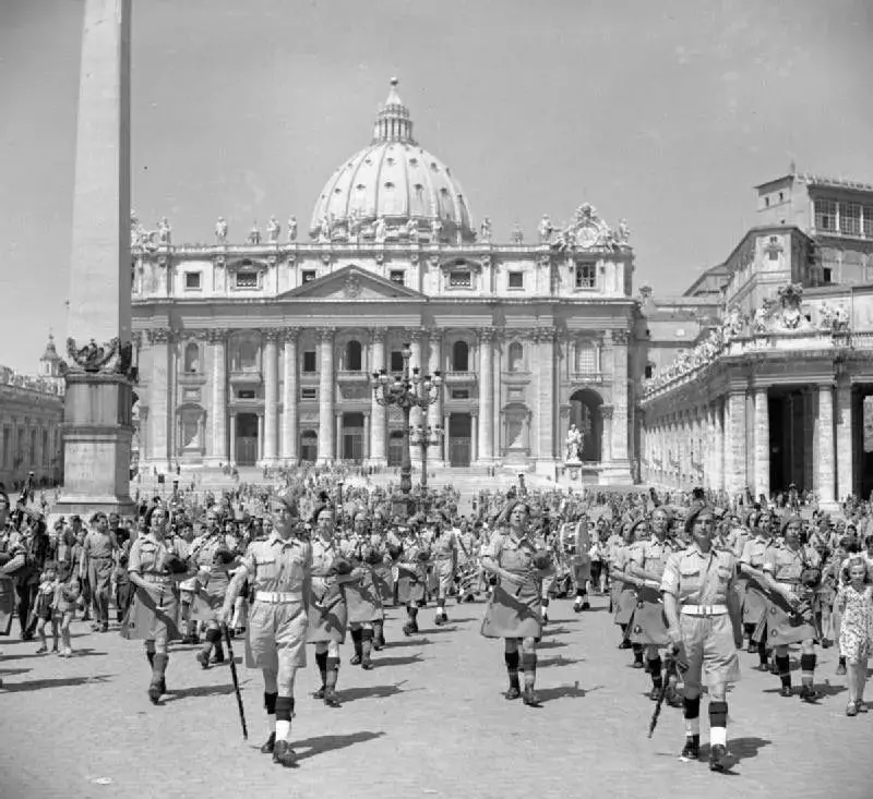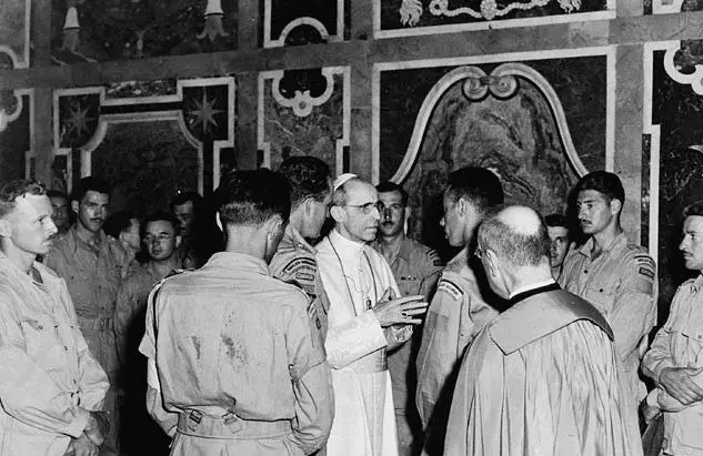 盟军于 1944 年 6 月 4 日至 5 日解放了罗马。在解放期间,许多盟军天主教士兵前往梵蒂冈参加弥撒并聆听教皇讲话,其中包括一些开军事车辆进入圣彼得广场的士兵。