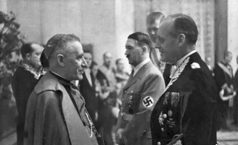 切萨雷·奥塞尼戈 (左,与希特勒和里宾特洛甫一起)梵蒂冈驻德国大使,同时还担任驻波兰事实上的大使。