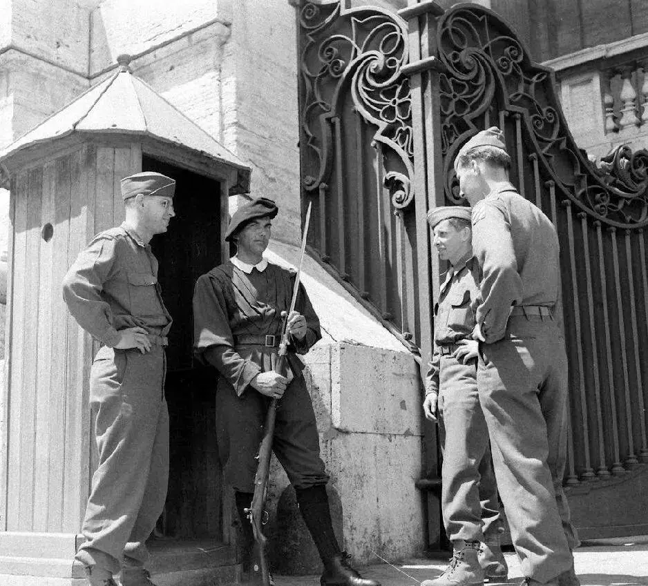 1944年6月12日,英国士兵在圣彼得大教堂前