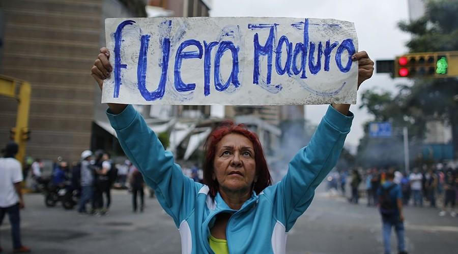 ▾2017年4月,一名妇女用西班牙语写着:“滚吧!马杜罗!”