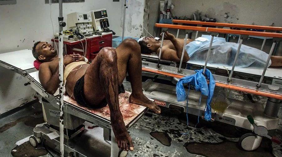 ▾由于缺少药物与医疗器材,外伤患者正等待医生用“土办法”救治