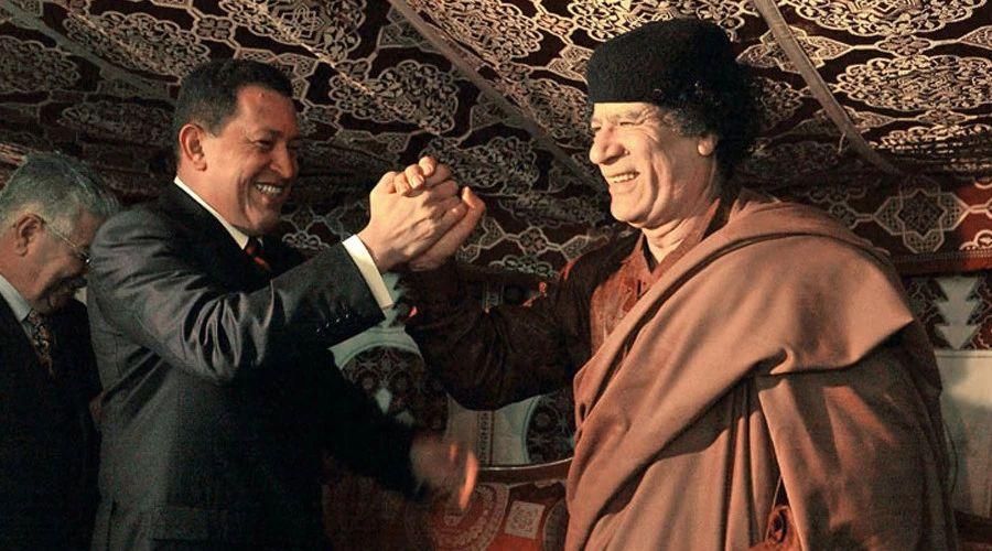 在卡斯特罗的撮合下,老查发现在北非又找到了一位“自己人”。他与卡扎菲彼此相互欣赏,并将其比喻为“利比亚的玻利瓦尔”。(玻利瓦尔要知道把他同一个被爆了菊花的人相比,棺材板就盖不住了… …这简直是对南美解放者的侮辱!)