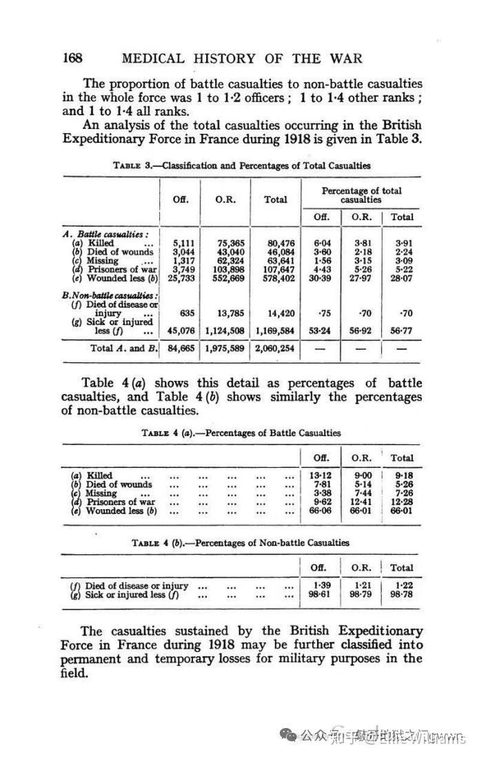 1918年:西线英军的所有陆军单位的战斗损失人数为876250人(见下图),加上RAF在3月份以后战损的约3000人,本年度英军在西线的战斗损失人数超过了87.9万人,这也是英军伤亡最大的一年,排除掉奥军给英军造成的少量损失,英军在对德军的作战中损失了87.8万多人,对面的德军本年度的损失人数在90.4万到90.5万人之间(具体计算过程如下:468431(十日报告统计的截止到10.20为止德军在对英作战中的负伤人数)*3262403/3088743+108508(十日报告统计的截止到10.20为止德军在对英作战的阵亡人数)+241148(十日报告统计的截止到10.20为止德军在对英作战中的失踪和被俘人数)+60000(10.20以后英军在西线给德军造成的损失)=904424),排除掉其中葡军给德军造成的损失,英军给德军造成的损失人数在90万人左右,双方交换比在0.98:1 左右,得益于百日攻势期间德军士气的崩溃和英军战术素养的大幅度提高,英军总算在战争最后一年里做到了交换比占优。值得一提的是本年度西线战场上的其他协约国军队(法军、美军、比军、意军、葡军)给德军造成的损失加起来也只有90.7万人,也就是说1918年德军在西线战场遭受的人员损失有一半是英军造成的,英军是战争末期联军在西线战场上当之无愧的扛把子和顶梁柱。不过,丘吉尔在回忆录中宣称皇帝会战期间英军作为防御方的损失要小于进攻方德军的说法是不实的,原因是他引用的1918年的英军的月度伤亡报告漏掉了约4万人的战斗伤亡(其中2/3是阵亡和被俘),这些人基本全部都是出现在皇帝会战的前期和中期(即3月到5月期间),然后再算上RAF的伤亡的话,因此英军在3月到7月期间的战斗损失人数不会低于484000人,同期对面德军的战斗损失人数约为477000人,排除掉葡军给德军造成的损失,英军给德军造成的损失大概在475000人左右,双方交换比约为1.02:1,可见在皇帝会战期间英军作为防守方的损失人数依旧略高于德军。同样地,丘吉尔宣称英军在百日攻势期间的损失人数超过了对面的德军,这种说法也是错误的,1918年8月到11月期间英军战损人数在37.2万人左右,排除掉少量奥军战果,英军在对德军作战期间的战斗损失人数约为37.1万人,同期对面的德军损失了约41.5万人,排除掉葡军战果的话,英军给德军造成的损失至少不会低于41.3万人(其中光俘虏就抓了17.6万人,如果加上俘虏的奥军数量,战争最后阶段英军抓获的俘虏数量超过了18.6万),双方交换比为0.9:1,可见在战争最后阶段英联邦军队即便在进攻中也能对德军打出优势交换比了。不夸张地说,在亚眠攻势以后,英联邦军队已经完全取代了德军的位置,成为了当之无愧的世界第一陆军,也是当时西线唯一一支能跟德军打出正的交换比的协约国军队。
