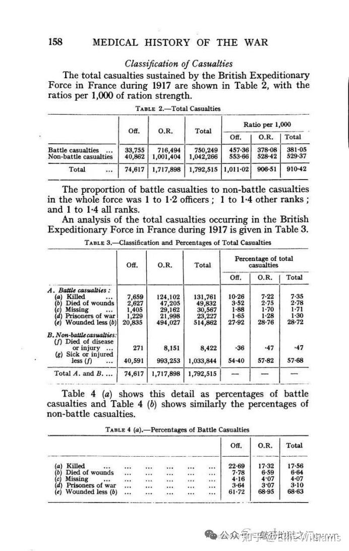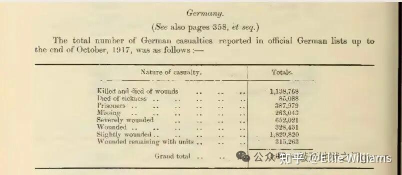 如下图所示,早在埃老登发明“德军不统计轻伤员”的谣言之前,“Statistics of the Military Effort of the British Empire during the Great War, 1914–1920”这本英国战争部于1922年编写的官方战史里引用的一份战后翻译的德军官方统计的截止到1917年10月底为止德军的人员损失统计明细的表格(这份表格包括了病死人数,但没算因其他非战斗原因导致死亡的人数)已经把埃德蒙兹这老登的脸给抽肿了,好家伙,发明历史之前居然连自家官史都没看明白啊。在这份表格里德国人明确地将伤员分为了四大类,分别是重伤员(Severely wounded)、普通伤员(Wounded)、轻伤员(Slightly wounded)和留队伤员(Wounded remaining with units)。顺带提一句,这份表格里提到的被俘人数并不完整,只是包括了那些被德军官方确认了的被俘人员而已,而那些没有被确认的被俘人员则依旧被包括在“失踪”(Missing)这一项里。