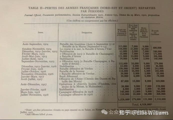 提到法军在西线的战斗伤亡情况,很多人都喜欢用丘吉尔的一战回忆录里的附录部分的这张表格(见上图),然而这张表格其实是一张废图。首先,这张表格没有计算法军军官的损失人数(尽管丘吉尔在注释里加上了法国军官死亡的3.6万人);其次,这张表格没有统计殖民地部队和外籍军团的损失人数;第三,这份表格包括了十几万非战斗死亡人数和80万被后送的重病号,表格里给出的311万这一列的数据实际上对应的是被疏散到了后方的伤病员的存活数量,而不是法军战伤数量;第四,这份表格没有统计那些没有被送到后方的轻伤员数量;第五,这份数据不仅包括了法军在西线战场的损失,也包括了法军在中东、意大利和萨洛尼卡地区的损失。实际上,关于法军在一战期间的负伤人数,目前史学界存在着有多种说法,比如230万、250万、280万、320万、340万、426.6万等等,口径不一致且十分混乱,在这里我想说一下我自己的看法,个人认为一战期间法国伤员的存活数量在320万人次(含多次负伤)是最合理的数据。战后美国战争部根据法国官方提供的内部信息统计出的426.6万这一数据很明显是在上图的311万的基础上加上了轻伤员和战伤死的人数而已,如果排除掉其中的80万重病号的话,那么法军战争期间的战伤人数为346.6万人次,其中法国陆军里的法国本土官兵死于战伤的数量为25万人(本数据出自1931年出版的“La Statistique médicale de l’armée”,即法国陆军官方的卫勤统计报告)占法国陆军里的法国本土官兵总死亡人数132.5万(此数据同样出自法国陆军官方的卫勤统计报告)的18.87%,而法国政府于1919年8月公布的法国殖民地部队和法国外籍军团的死亡人数为75700人,这个数据不包括1919年6月1日以后因战争期间留下的战伤而死于疗养院的那些官兵,如果把这些也算上的话,实际死亡人数可能在76000左右,75700*18.87%=14341,250000+14341=264341,264341/3466000=7.63%,和英德伤员死亡率差不多,很显然这个比例才符合真实情况。考虑到战争期间法国动员的本土人员的数量(793.5万)是其动员殖民地和外籍人员数量(47.5万)的16.7倍,殖民地官兵和外籍官兵的非战斗死亡率和法国本土官兵一样的话,那么他们的非战斗死亡人数约为1.05万人,所以,我个人推测一战法军的战死和死于战俘营里的人数加起来大约在121.5万左右(其中约115万人来自法国本土),其中死于西线的数量应该在120万左右。另一方面,按照德国方面的统计,有520579名法军战俘活着走出了德军战俘营,这些人基本全都是在西线被俘的,只有极少数是在意大利和萨洛尼卡被德军俘虏的,综合来看,德军在西线俘虏的法军官兵里活到终战的应该不会少于52万,所以,战争期间法军在西线的战死和被俘人数加起来在172万人左右。而法军320万战伤里应该也有不少于315万是出现在西线,因此法军在西线的实际战斗伤亡人数在487万左右应该是一个比较合理的估值。目前已知英军和美军给德军造成的损失人数加起来在202.6万左右,这就意味着其他的协约国军队(法、比、葡、意、俄等国军队)在西线给德军造成了约325.4万人的损失,保守估计其中大约有317万人是法军的战果,487万比317万,法德两军的交换比为1.54:1(考虑到法国殖民地部队的战斗力显著强于本土部队,如果单算法国本土部队的话,双方交换比估计在1.6左右),确实比英军和德军之间的交换比要高一点。