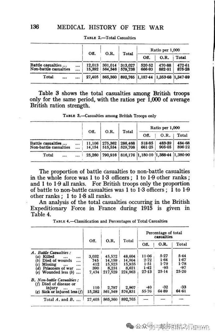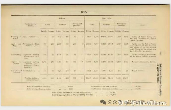 下图是1922年英国战争部统计的1915年2月到12月期间英德双方的各自损失情况,德方数据来源是十日报告,这份表格问题很大,除了表中德方伤员数据比实际数据稍微偏低以外,表中的英军伤亡数据中的完全排除掉了负伤后死亡的伤员数量并且还漏报了一些轻伤员,导致表中出现的英军数据严重偏低,比1931年出版的英军卫勤统计给出的数据少了差不多4万人(用英军卫勤统计报告里给出的1915年英军伤亡31.3万多人的数据减去1月份伤亡的6000多人,那么在2月到12月期间英军战斗伤亡人数约为30.7万人,而不是26.7万)。1915年英军给德军造成的伤亡人数的推算过程如下:74275(表格里给出的德军军官和士兵的负伤人次的汇总)*3262403/3088743+20652(表格里给出的德军军官和士兵的阵亡人数汇总)+15433(表格里给出的德军军官和士兵的失踪和被俘人数汇总)+5000(1月份的损失)=119536。