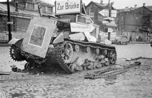 (上图)斯摩棱斯克街头被改造成路标的T-26坦克;斯摩棱斯克交战失利是个重要因素,一定程度上促成了暂缓向莫斯科进军的决定