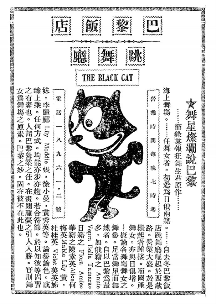 1927年末日记中刘呐鸥最爱去的舞厅之一“黑猫”,又名“巴黎饭店”,此为1928年舞厅广告(刊于《舞星艳影》)