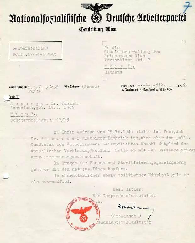 紧接着,挖掘出来的其他证据也显示他确实是纳粹杀人机器的同谋。在他亲笔签署的转诊信中,他至少签下了两名儿童的死亡判决书,并将其送往维也纳的专门儿童安乐死中心。同时,有一个委员会向该中心送交了数十名儿童。而阿斯伯格则刚好在该组织里担任要职。调查显示,所有儿童无一例外地死在这个中心。