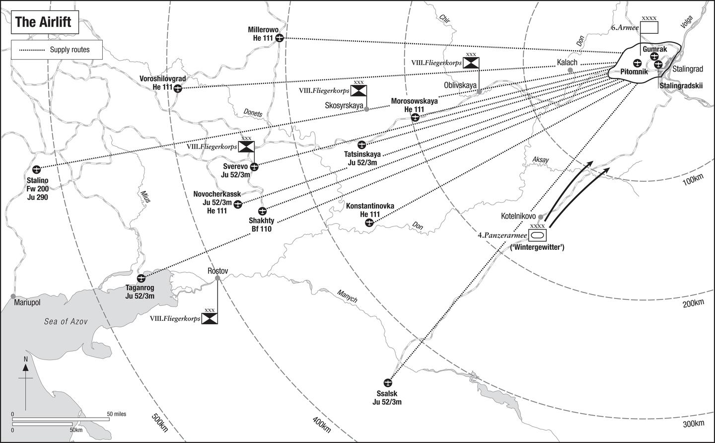 除此之外,德军在距离斯大林格勒市区仅几公里的斯大林格勒斯基(Stalingradskij)修建了一条简易野战跑道,这条跑道在古姆拉克机场失守后还能使用几天。虽然该跑道始终处于苏军炮火威胁之下,但仍有一些运输机成功在那里着陆并带走部分伤员,最后一架运输机于1943年1月23日从斯大林格勒斯基起飞。