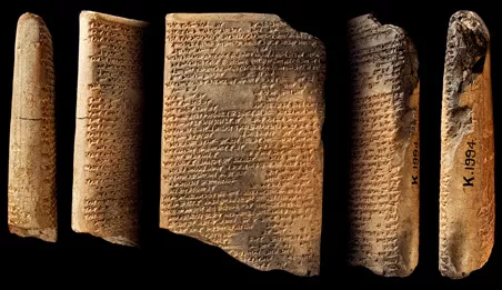 △曾收藏在亚述巴尼拔图书馆中的书写有楔形文字的泥板片段。