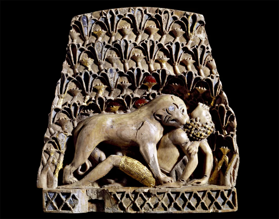△同样是对于猎狮场景的描绘浮雕,只是这件浮雕中的猎狮人不幸惨死狮口。