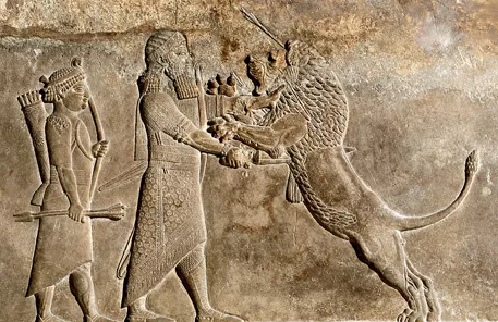 △在对亚述帝国的考古发掘中出土了大量描绘关于国王猎狮场景的浮雕,图中为其中之一。