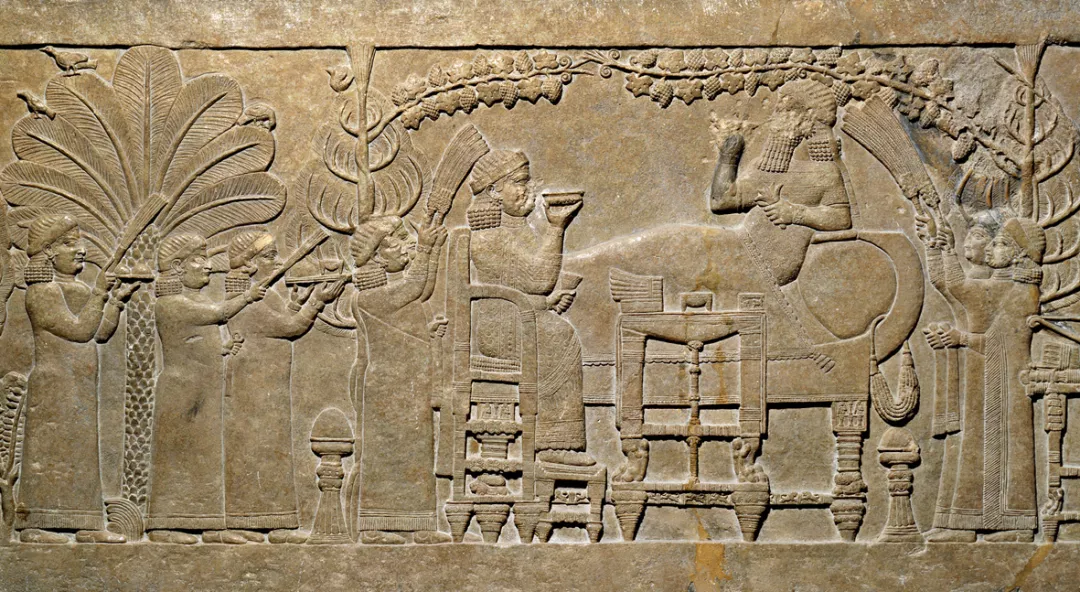 △浮雕描绘亚述巴尼拔国王正在他宫殿的花园中休憩的场景。