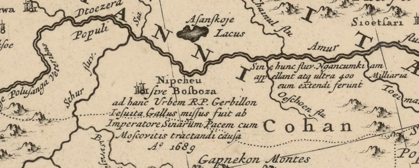 二〇一五年求学巴黎期间,笔者曾在法国国家图书馆的地图部看过一幅图,这是荷兰制图师弗雷德里克·德·威特(Frederick de Wit)出版于一六八九年的《鞑靼、蒙古、日本与中国新地图》(1689,BNF, Cartes et plans, GE D-16737)。其中,在长城以北的尼布楚城(Nipcheu)一带,作者用拉丁文标示了一段文字,内容是:“一六八九年,法国的耶稣会士Gerbillon(张诚)被中国皇帝派到这个城市,与莫斯科协商和平方案。”