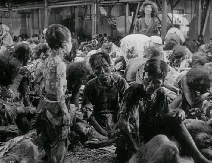 克莱因佐格神父和其他精疲力尽的神父们一起来到河边的浅野公园避难。这里几个小时前还是一片精致的日式园林,现在却充斥着不可言说的恐怖。早就赶来或者正在赶来的幸存者成百上千,已经断气和快要断气的受害者倒卧一地。烧伤最严重者,面孔已经如抹脏的油画一般模糊不清。核爆引发的狂风席卷全城,公园附近随之出现一股剧烈的旋风;它所到之处,刚刚躲过核爆劫难的树木都被连根拔起,卷在半空。随后旋风进入河里,卷起100 米高的水柱,离开时又将惊恐的避难者扫进水中。