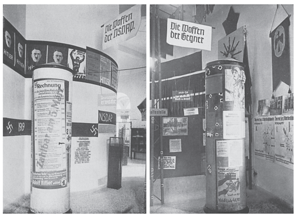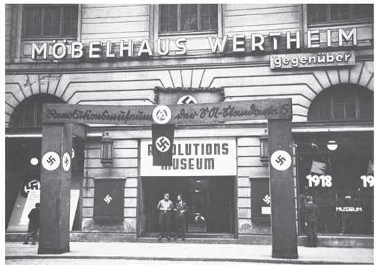 1933年9月15日,一座全新的博物馆在柏林开放。它的目的是纪念最近改变了德国政治格局的事件。主展厅陈列着从共产主义街头战士那里收缴的成堆武器,以及从位于卡尔·李卜克内西大楼的共产党办公室偷来的物品。一个真人大小的男性时装人体模特歪歪扭扭地站在那里,面颊上涂着胭脂,表情怪异,穿着一件共产主义准军事组织红色阵线的制服,腰带上插着一把刀、一把手枪、一把匕首,右手拿着一根由金属电缆拧成的短棍。旁边是一个高高的玻璃柜,上面贴着“来自费舍尔基茨(一个贫穷的地区,以前由德国共产党控制,位于施普雷岛的南端,这个小岛现在是柏林市中心的一部分)的凶器”的标签,里面摆放着成堆的手榴弹、棍棒、刀、匕首、手枪、子弹和镶着共产主义徽章的尖顶帽子。墙上胡乱地贴着来自“斗争年代”的政治海报。相邻的一个房间被留作“荣誉殿堂”:纳粹党的旗帜装饰着新古典主义的纪念拱门和铭刻着阵亡纳粹党人名字的牌匾。