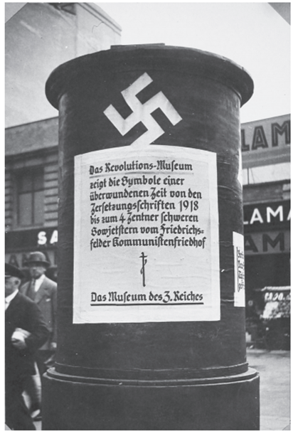 对政治时间性的研究者来说,这些机构比任何事物都更令人感兴趣,因为作为机构的博物馆一直都是操纵时间认知的工具。博物馆的设备既可以用来拉开观众与所展示的时代或现象之间的距离,也可以建立一种即时感。正如马丁·罗斯所展示的那样,1924—1932年,博物馆建筑大幅增加,这类机构的文化权威得到提升,博物馆的内容被戏剧性地“现实化”——革命博物馆的一些特征借用了魏玛共和国早期具有左倾色彩的“社会博物馆”,这些展览从内容上看都是指向当下的。在布置革命博物馆风格的时候——给展品贴标签或者使用玻璃柜,策展人试图将观众与民族社会主义改革的现实联系起来,同时将魏玛共和国限制在过去,共和国的生命延续到了展览开始的9个月后。柏林市中心报纸专栏上的海报写着:“革命博物馆象征了一个被取代的时代。”戈培尔在展览评论中指出,展出的物品只是遗迹,让人想起过去的时代。他写道:“只有在记忆中,……那些嗜血的(共产主义)恐怖的日子才会重现。”另一位政党记者在1937年观察到,这些落败左翼的“象征”目的是唤醒人们对“一去不返的时代”的记忆。挂在墙上的左翼海报是“死气沉沉的破纸,就像上面写着的箴言一样死气沉沉”。魏玛共产主义者的各种用品被放置在玻璃箱中并被贴上标签,就像是许多人种博物馆和日耳曼史前博物馆里缄默的陶器碎片和金属饰物那样。