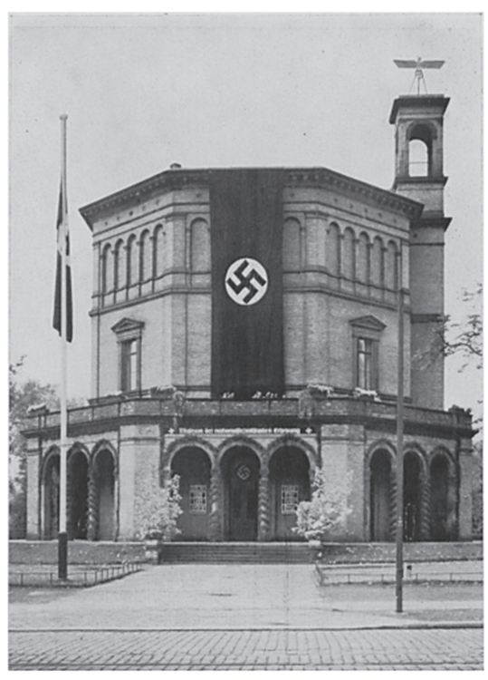 与柏林革命博物馆同类型的机构还有很多。哈雷、卡塞尔和杜塞尔多夫也有类似的建筑,更不用说在许多其他地点设立的用于纪念民族社会主义运动的“成就”和“牺牲”的荣誉殿堂。这些并不是政权命令的结果,而是由各区冲锋队的领导层推动的地方举措,通常与大区当局合作。冲锋队建立这些机构似乎是为了宣传其在纳粹夺取政权中的作用。地方冲锋队领导层也参与了哈雷德国起义博物馆的开设,在杜塞尔多夫的革命展览馆中发挥了重要作用,并合力建造了多座荣誉殿堂。在柏林革命博物馆附近,冲锋队的军队曾遭遇共产党的殊死抵抗。位于拐角处的教区大街29号是曾经的柏林反战博物馆的馆舍,这是一个拥挤而混乱的场所,由和平主义者恩斯特·弗里德里希(1894—1967)创建,他利用图像和物品——包括伤残士兵的照片——来唤起人们对军事暴力的恐惧。1933年3月,当地冲锋队洗劫并没收了博物馆,然后将其改造成冲锋队的休闲场所和刑房。