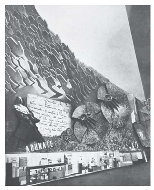 如果将这些展览与意大利法西斯为庆祝其政权的建立所做的类似努力进行比较,可以揭示出一个值得深思的反差。法西斯的超级展览“法西斯革命展”于1932—1934年在罗马展出,吸引了超过350万参观者。它不是传统的展览,而是一个充满活力的空间,人们可以在其中体验“行进中的历史”。一个由精心排列的大厅和房间组成的巨大综合体,营造了一种“永不停歇的运动和变化”,一种“煽动、压迫和迷失方向”的感觉。