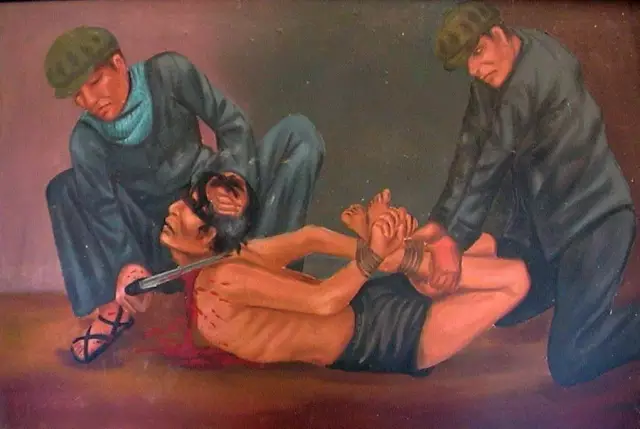 这是一组描绘红色高棉统治时期残酷统治的画作,是柬埔寨画家Van Nath根据自身的经历所创作的。他当时所在的S-21集中营声名狼藉,以酷刑著称。Van Nath曾看到过男囚犯被鞭打、指甲被拔掉、手脚一起被绑在木棍上的惨状;也看到过监狱看守残酷对待女囚:伤害女囚犯的私处,用钳子把她们的乳头钳掉。据估计在1975年至1979年红色高棉执政期间,S-21集中营至少关押过14000至15000名囚犯(部分人相信总数超过20000人),其中仅有7人幸免遇难。