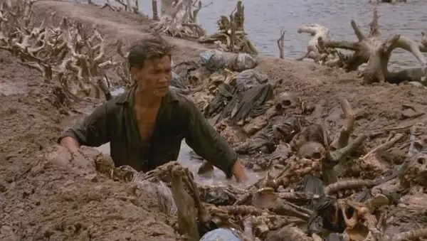 上个世纪80年代初,在S-21发掘出近9000具尸体。这些人死得极其恐怖,“红色高棉”时期,为了节省子弹,杀人多用棍棒重击或以斧头砍杀。许多陈列的头盖骨上,都有被斧头砍出的裂痕。电影中,狄潘在逃亡的过程中误掉进了一个白骨累累的“万人坑”,镜头虽然不多,但极具震撼力: